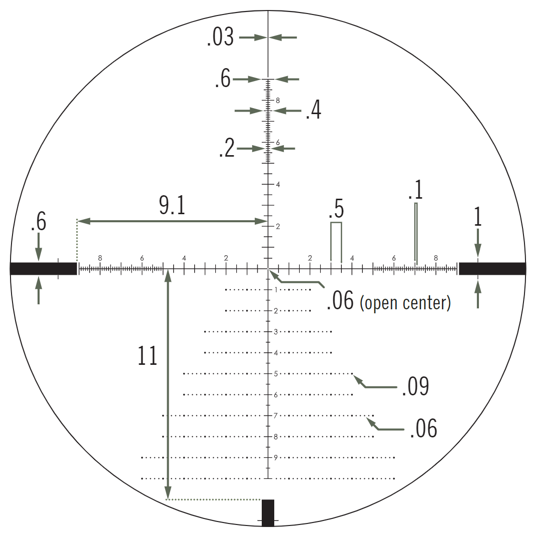 第一个焦平面分划线:分划线的比例保持与缩放图像成比例。恒定的升降允许在所有放大倍率下准确保持和测距。